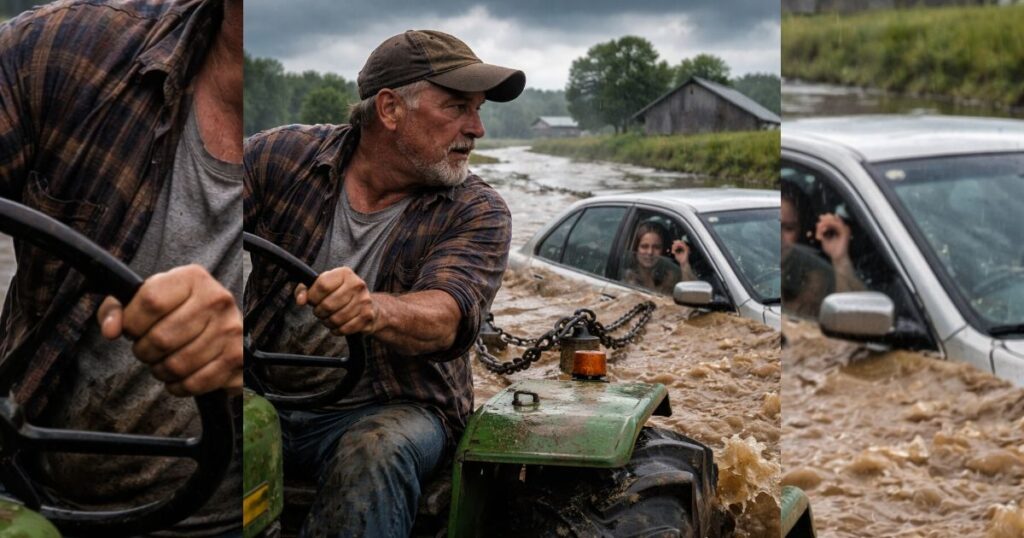The ground near the road had turned slick as grease. Every pass of the tires chewed deeper into mud. He fought the wheel, trying to keep the tractor lined up with the car while the water surged past, angry and fast.