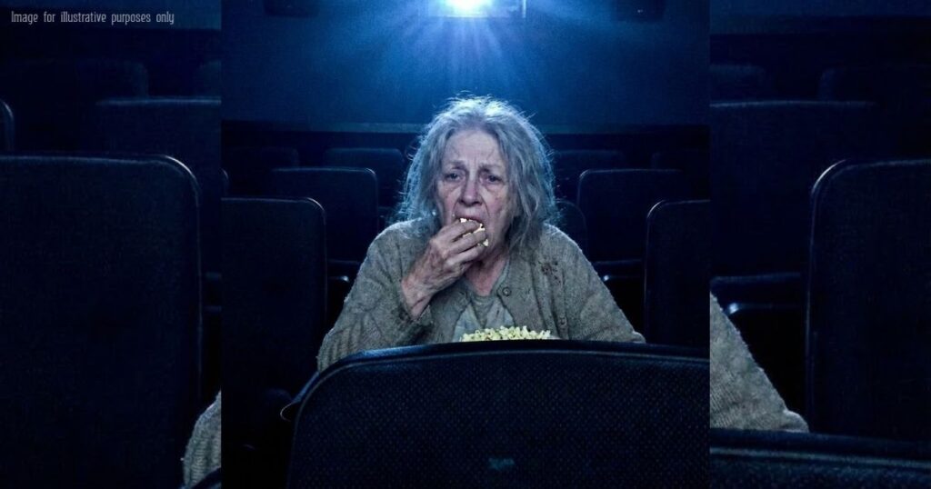The theater is mostly emptyâtwo teenagers in the back whispering, a man asleep with his mouth open, and a woman in the front row who hasnât moved since the previews. White hair. Pink scarf. Hands folded like sheâs at church.