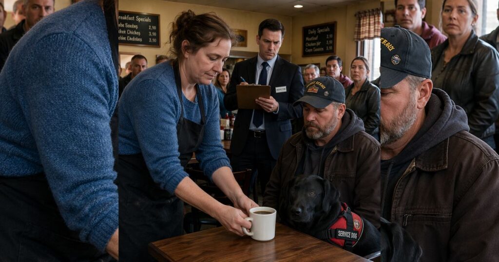 She set a mug of coffee in front of a veteran and his service dog while the compliance inspector was still watching, and ten minutes later her boss erased six years of loyalty with one cold sentence.