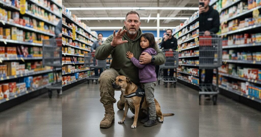I dialed with clumsy fingers while he shifted to stand fully between her and the rest of the aisle. The dog moved with him like they’d rehearsed it a hundred times, planting its body as another shield. Two employees with radios hovered at the end of the row, unsure whether to intervene or stay back. “Customer service counter,” the veteran told them, jerking his chin toward the front as his hands kept signing. “Cameras. Witnesses. We’re not doing this in the middle of frozen foods.”