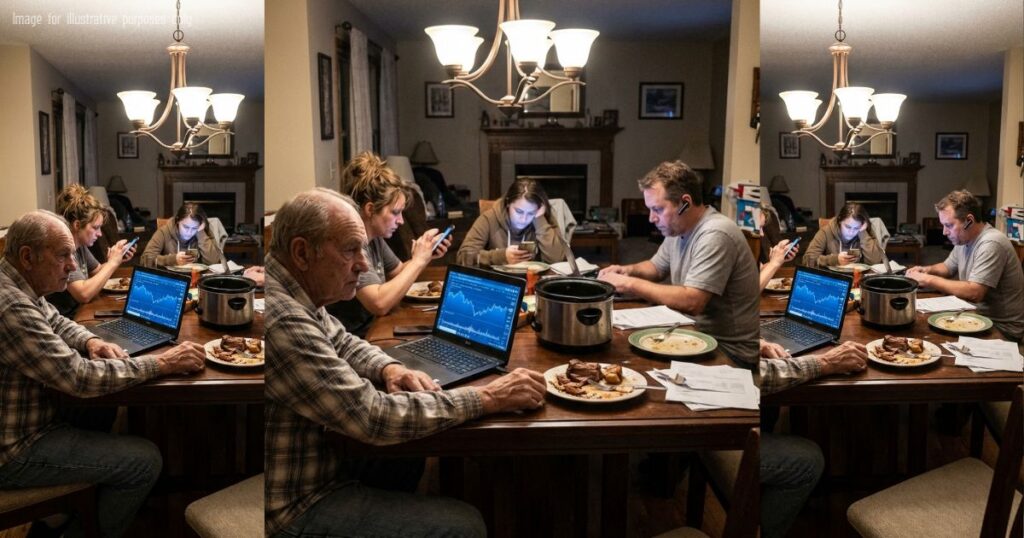 I sat at the head. My wife’s empty chair was at the foot. Between us sat my three adult children, strangers bathed in the blue glow of their devices.