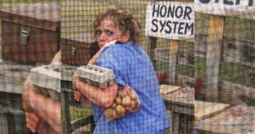 Then, she did it. She grabbed the eggs. She grabbed the potatoes. She moved fast, terrified, looking over her shoulder. She didn’t check the lockbox. She just threw the food into her passenger seat and sped off, gravel spraying against the “Honor System” sign.
