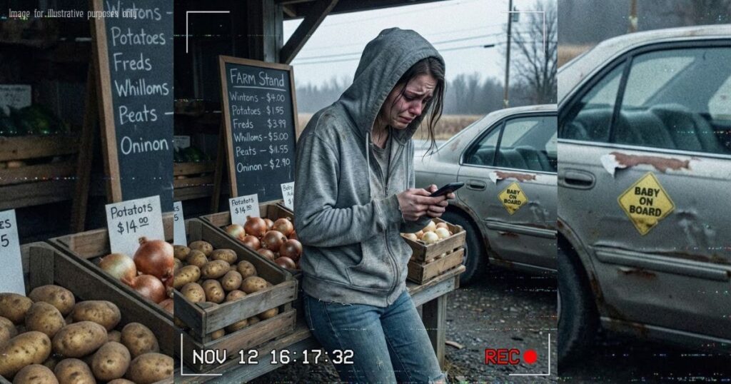 She grabbed a carton of eggs. She grabbed a bag of russet potatoes. She looked directly at the camera lens—terrified, desperate—and then she ran. She threw the food into the passenger seat and sped off, tires spinning on the gravel.