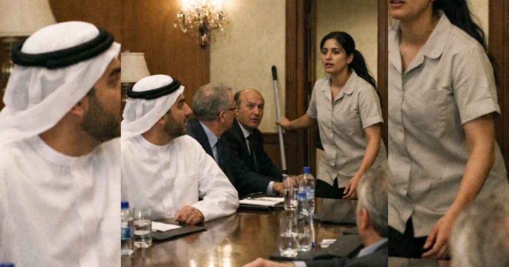 The housekeeper set down her mop, spoke one sentence in flawless Arabic, and stopped a billion-dollar deal from collapsing—while the people in tailored suits laughed, stared, and realized too late they had been judging the wrong woman.