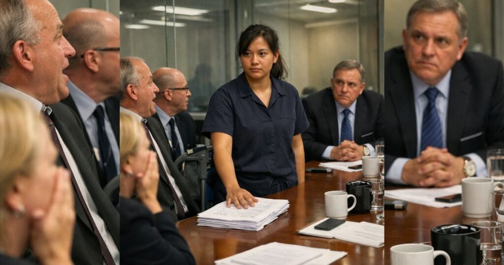 I was wiping coffee rings off a conference table worth more than my mother’s yearly medical bills when Victor Raines slapped a thick document onto the polished wood and said, “Tell me somebody in this room can read this.”