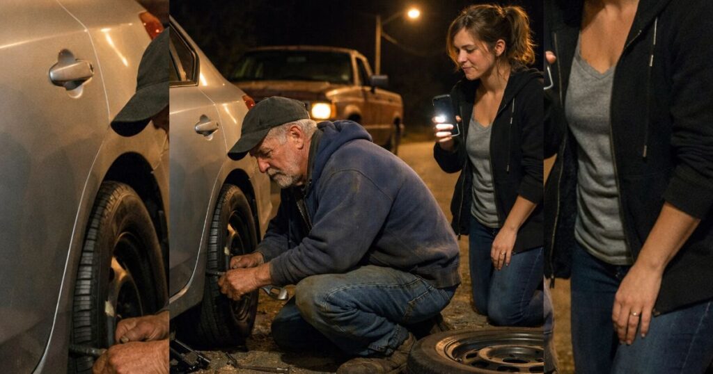 She wore nice clothes, the kind that looked too clean for a county road after midnight, and shoes nobody in their right mind would wear while crouching beside a busted tire.