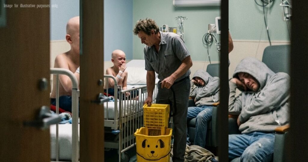 A tired one. A scared one. A room with plastic chairs, humming machines, stale coffee in a paper cup, and a janitor on his knees pretending a mop bucket was alive.