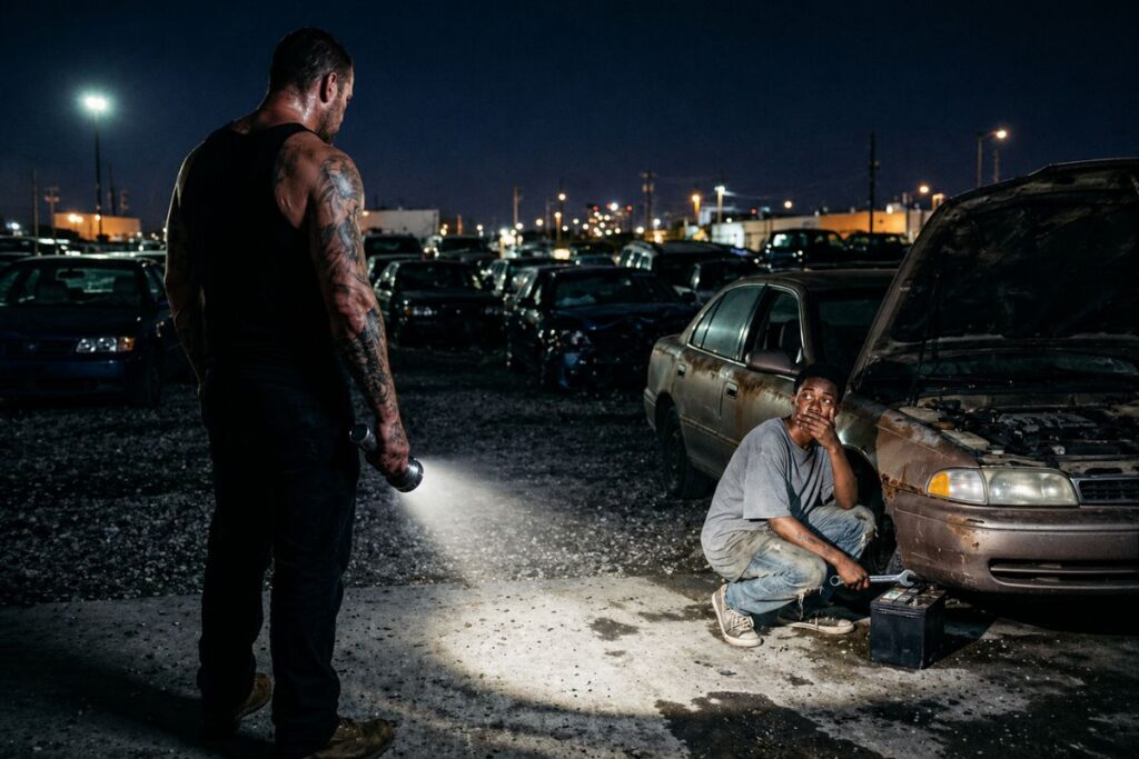 “You’re a long way from home at midnight,” I said, keeping my voice low and steady. “And you’re pulling a twelve-volt battery out of a junked sedan. Why?”