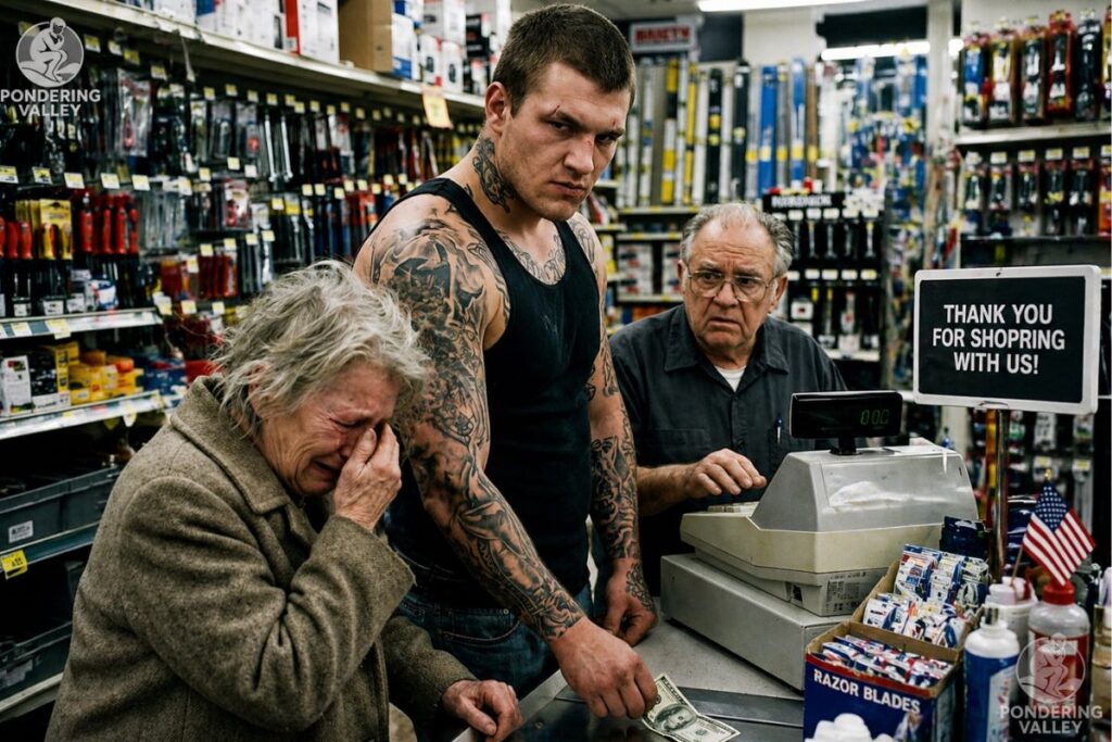 A terrified cashier watched a heavily tattooed ex-con approach a weeping elderly woman at the register. What he did next brought the entire hardware store to tears.