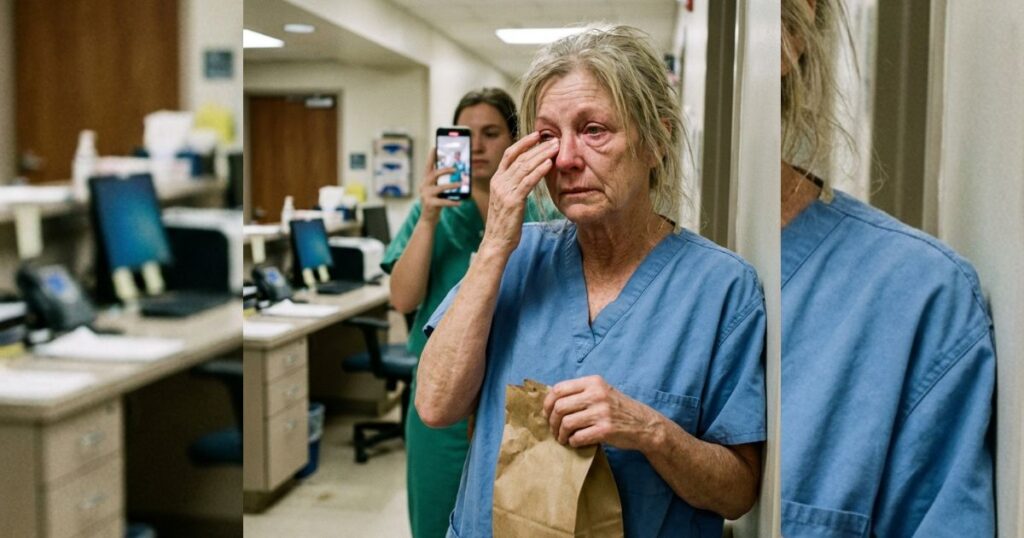 There I was in blue scrubs, face red, hair flattened from twelve hours under bad lights, standing beside an empty nurses’ station with a paper bag of retirement gifts pressed to my chest.