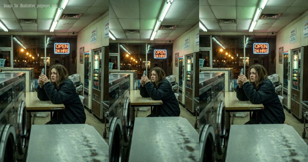 Her name is Mia. She’s one of the “ghost shift” kids—driving delivery orders all night for people who can afford to sleep. She comes in here to charge her phone and steal warmth from the dryer vents.