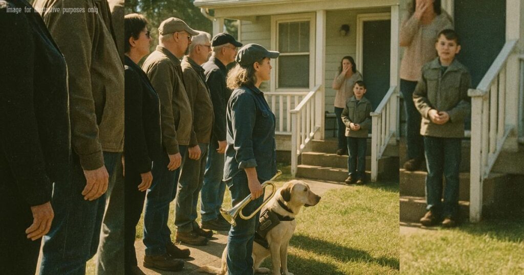 Phones started pinging then, slowly, like rain beginning—first the neighborhood app, then the community group, a cousin in another state. Ms. Alvarez had posted a photo she snapped when the line first formed: boots, a bugle, a service dog, and a boy pinching a coin like it was a star. She’d captioned it with exactly nine words: They showed up for a child. Pass it along.
