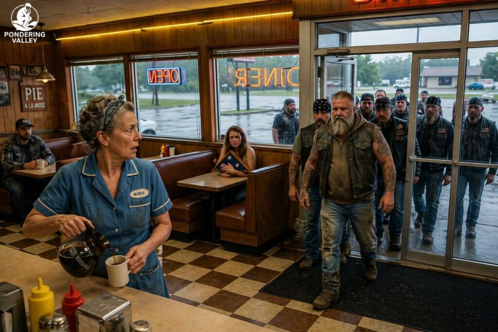 Maria froze behind the counter, the coffee pot trembling in her sixty-year-old hands. One by one, massive men wrapped in heavy leather, metal chains, and road dust pushed their way into the small, quiet dining room.